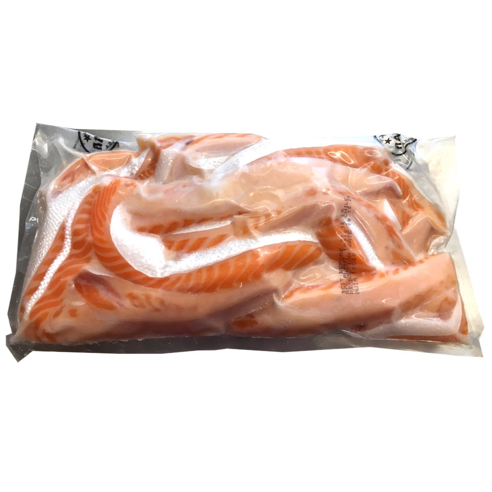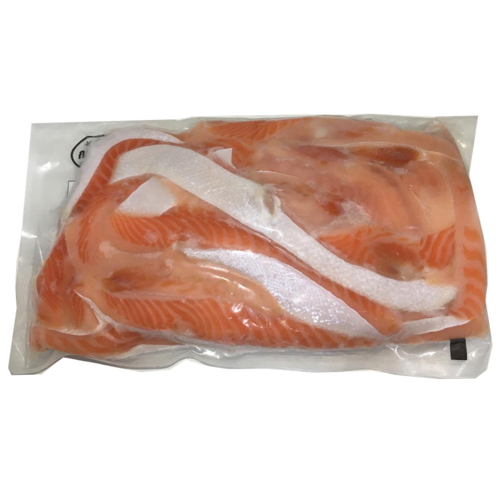 Belly de Trucha, salado y con piel. Full grasa. Producto congelado y sellado al vacío. Para cocinar a parrilla o grill. Envase 1kg.